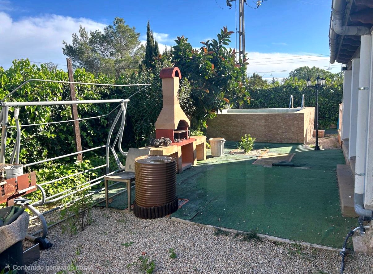 El exterior dispone de zona ajardinada y de cultivo, terraza con barbacoa y piscina tipo safareig de 10 m².