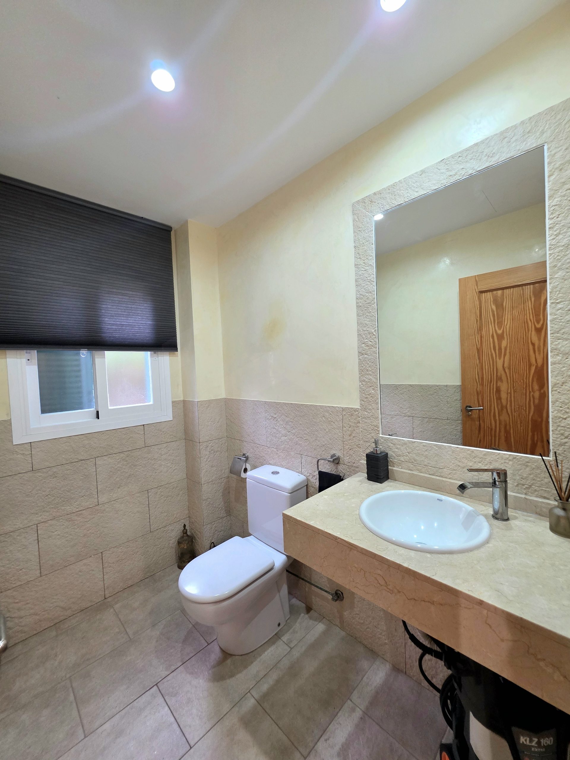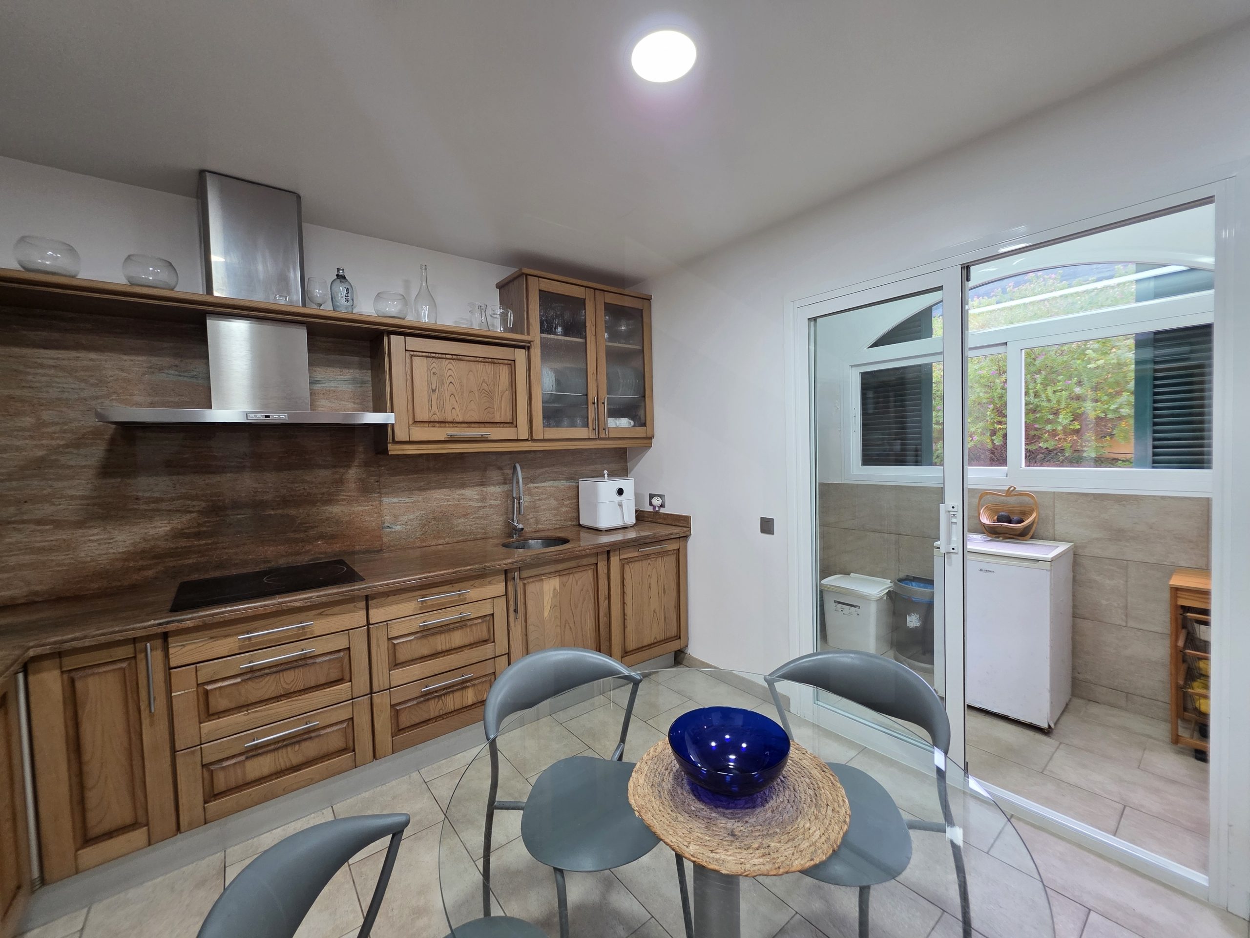 En la planta principal encontramos un amplio recibidor con armario doble, un aseo de cortesía y una espaciosa cocina totalmente funcional, con despensa y coladuría independiente. El salón-comedor cuenta con salida directa al porche y a un agradable jardín privado de aproximadamente 90 m², con árboles frutales, palmeras y diversa vegetación, además de zona de barbacoa, todo ello con agradables vistas a la montaña, perfecto para disfrutar del aire libre.