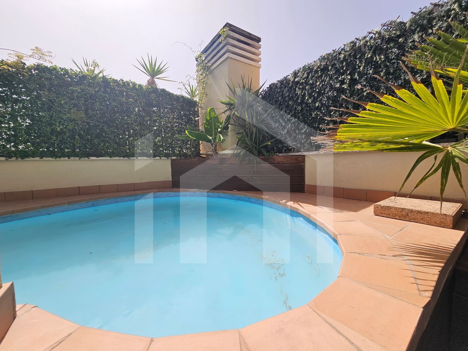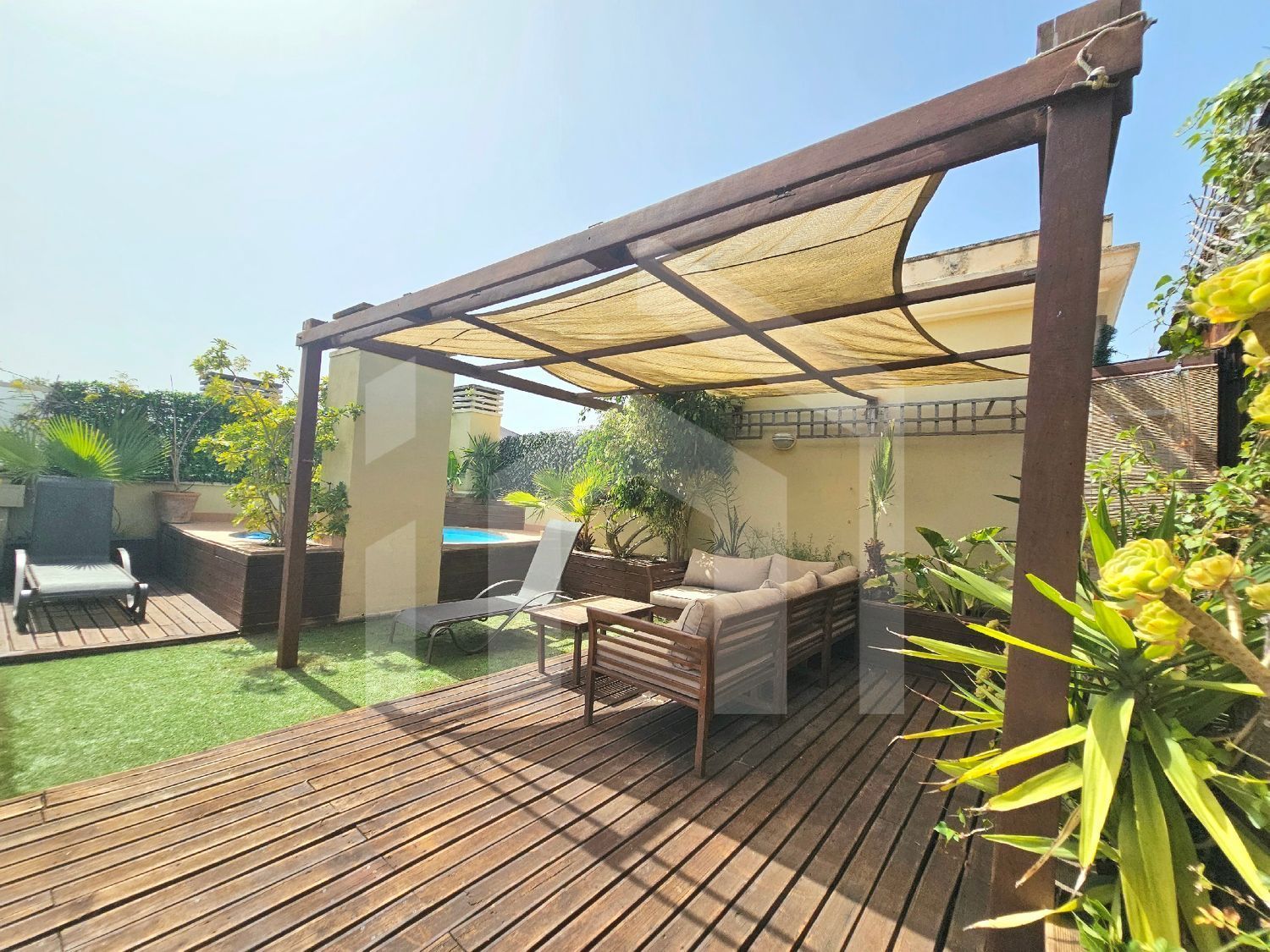 Terraza con barbacoa, zona de descanso, solarium, piscina con cascada con vistas despejadas al Castillo de Bellver.